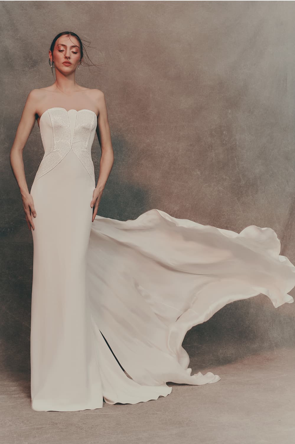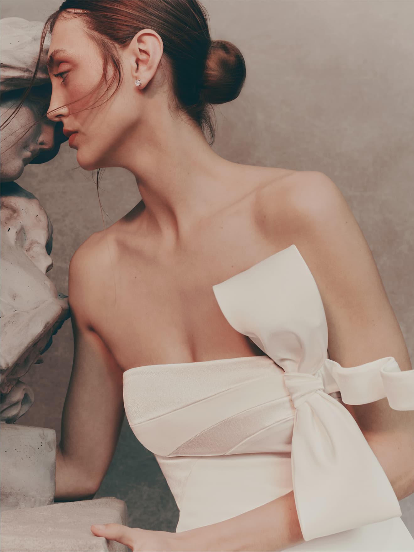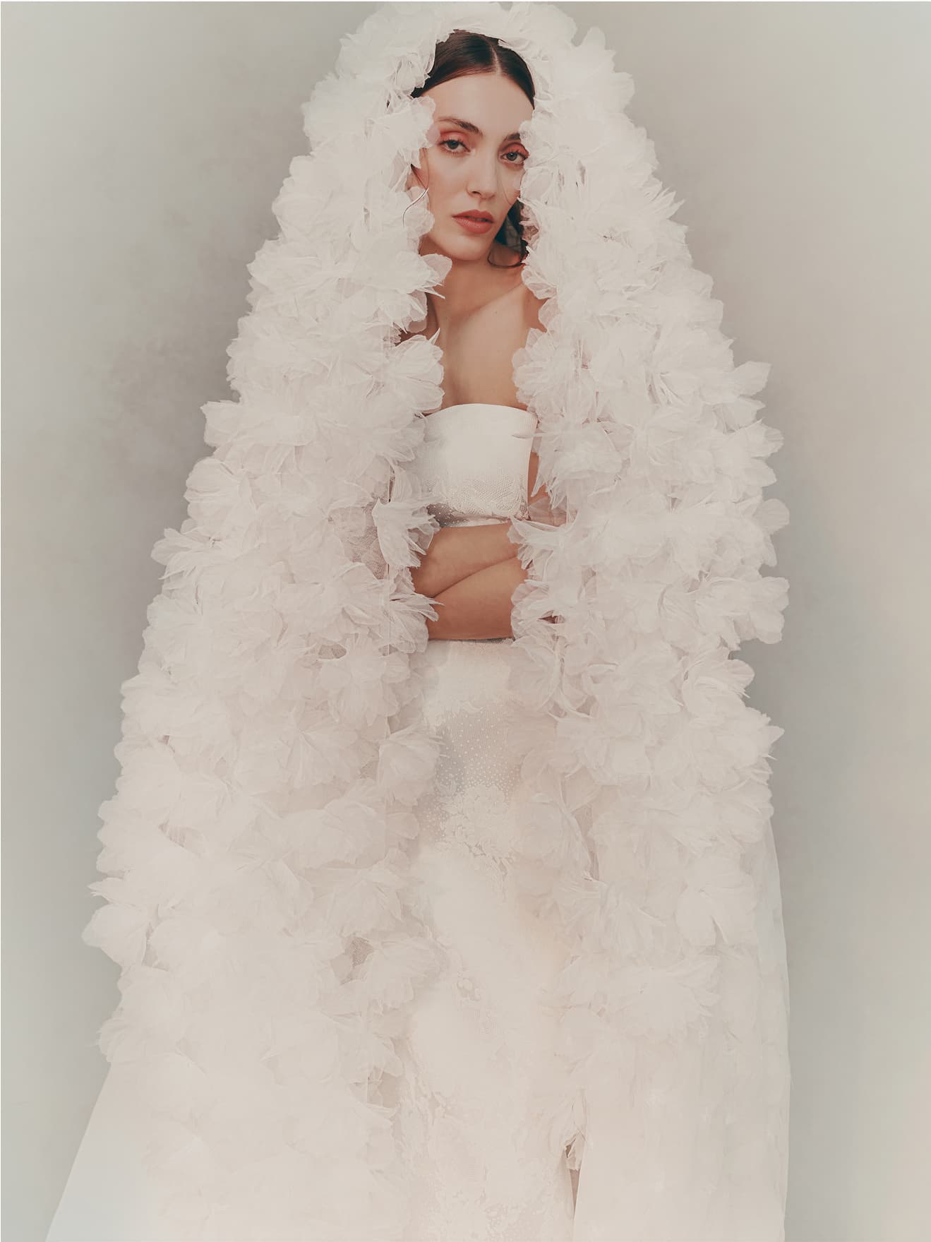 Nesta temporada, são introduzidos vestidos com duplo visual, oferecendo dois estilos deslumbrantes em um só, transformando-se de sobressaias românticas de renda para silhuetas elegantes de cetim ou crepe. Novos cortes, estruturas leves e texturas contrastantes, como organza com jacquard ou cetim com crepe, trazem modernidade à alta-costura atemporal.