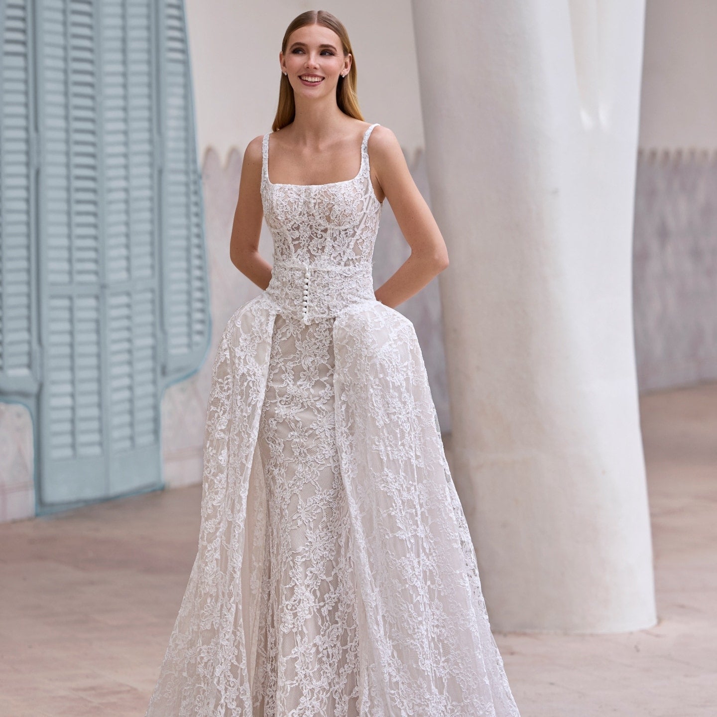 Versatility continues to be a key trend for 2026–2027 brides. Lightweight slip dresses in crepe or satin are paired with detachable elements: lace capes, chiffon coats, overskirts, and accessories that allow a single look to evolve throughout the day. Short dresses will continue to rise as sophisticated second-look options, reflecting the bride’s desire for flexibility and personal expression.