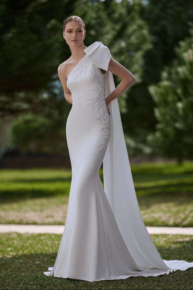 Chiffon and crepe are beloved wedding dress fabrics known for their graceful drape and light movement, making them favorites for gowns that feel effortless and romantic. Chiffon wedding dresses are especially popular for outdoor or destination weddings, thanks to the fabric’s sheer, breezy quality. Crepe, by contrast, has a slightly heavier weight and subtle texture, allowing it to skim the body with elegance while still offering gentle structure.