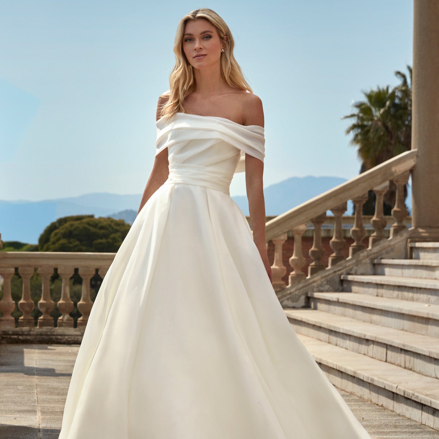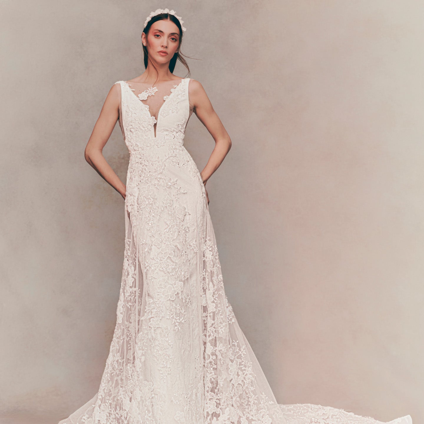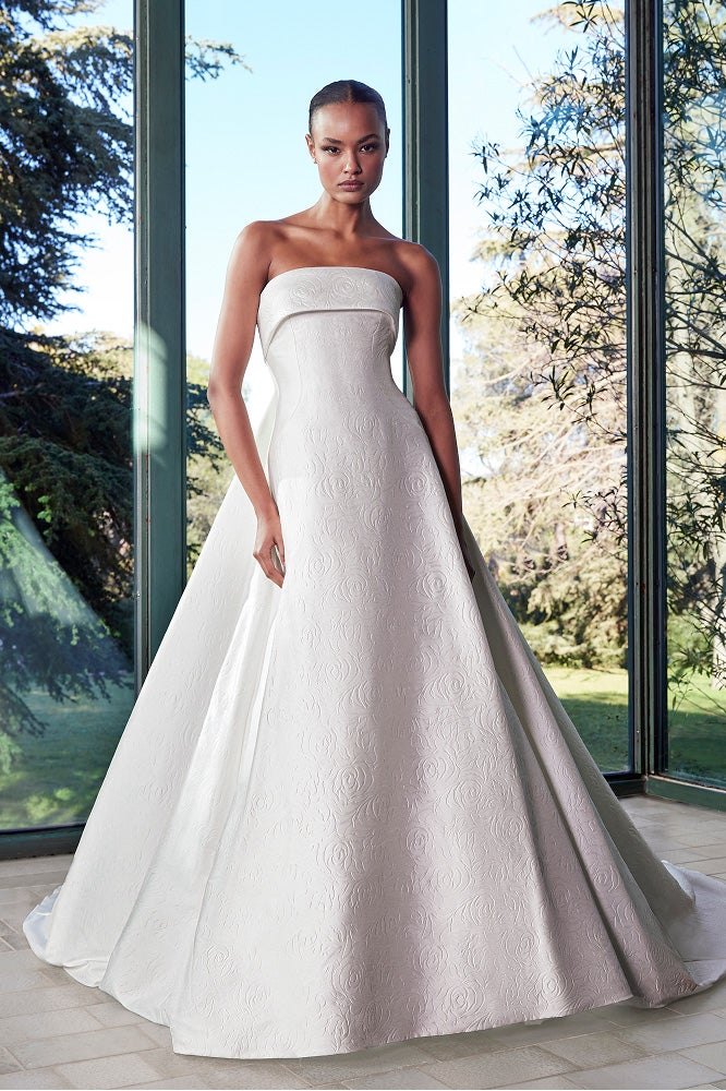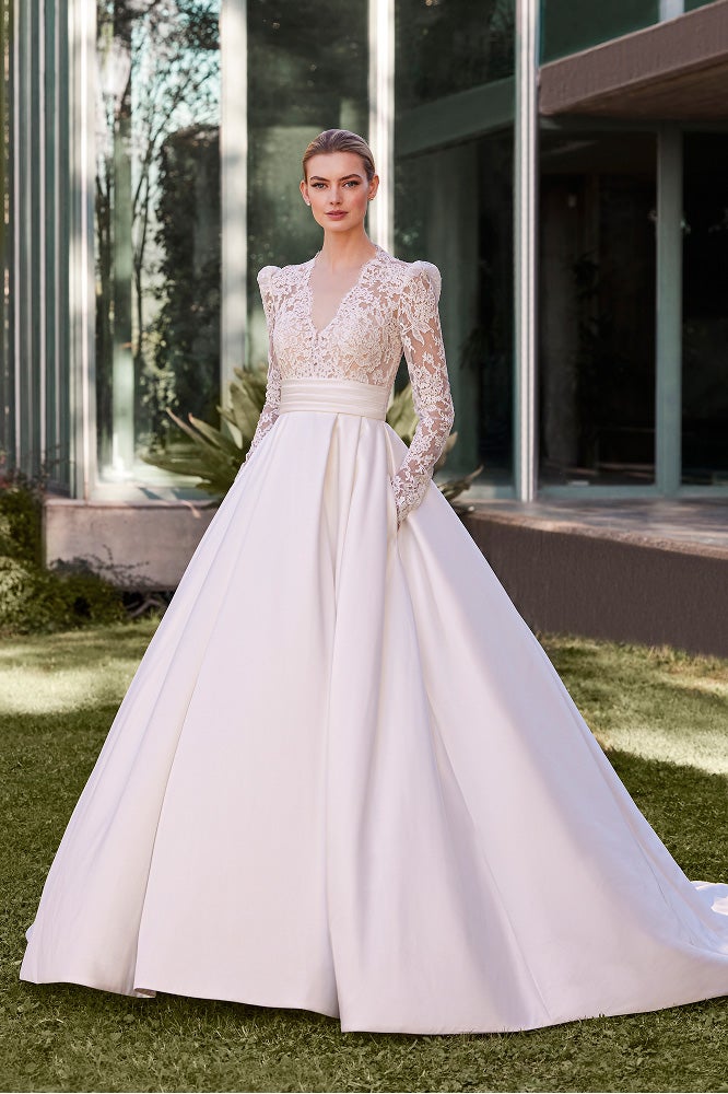 For brides seeking balance and refinement, A-line wedding dresses are among the most popular wedding dresses for 2026. This universally flattering silhouette continues to evolve, with sheer overlays, structured pleats, and modern necklines adding new dimension. Fabrics such as Mikado and chiffon bring softness and versatility, creating gowns that move beautifully through day-to-night celebrations.