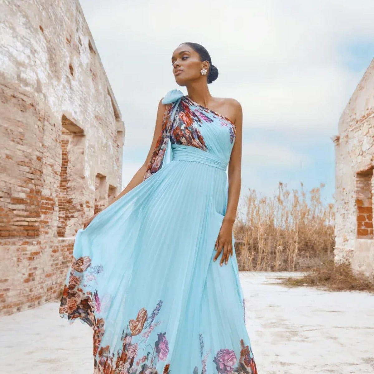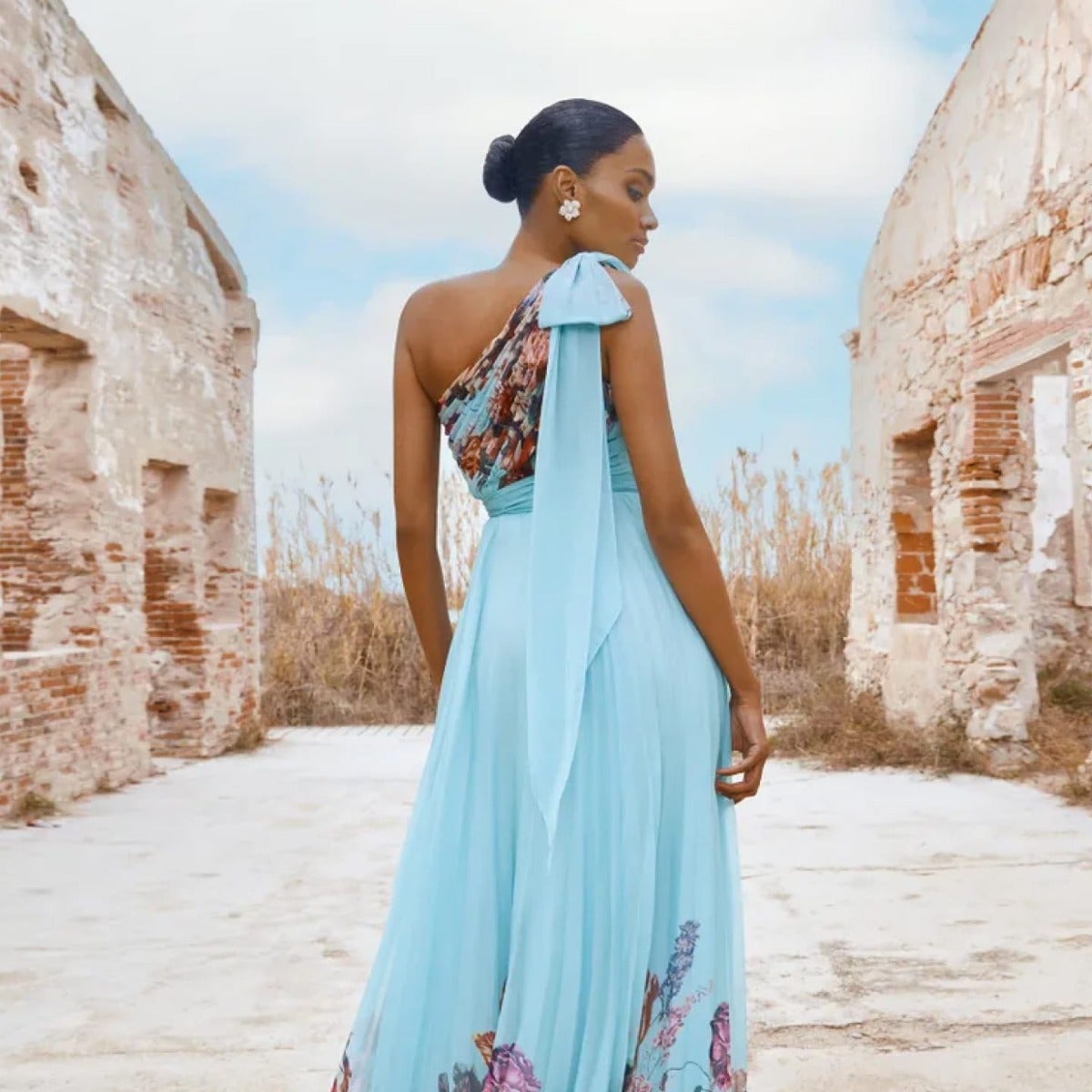 If you prefer a playful yet flattering baptism outfit, consider an asymmetrical one-shoulder dress, ideal for a warm-weather, outdoor event. The single-shoulder design elongates the silhouette, creating a sophisticated style that works well with sparkling shades, making it a fun choice for late summer or festive period invitations.