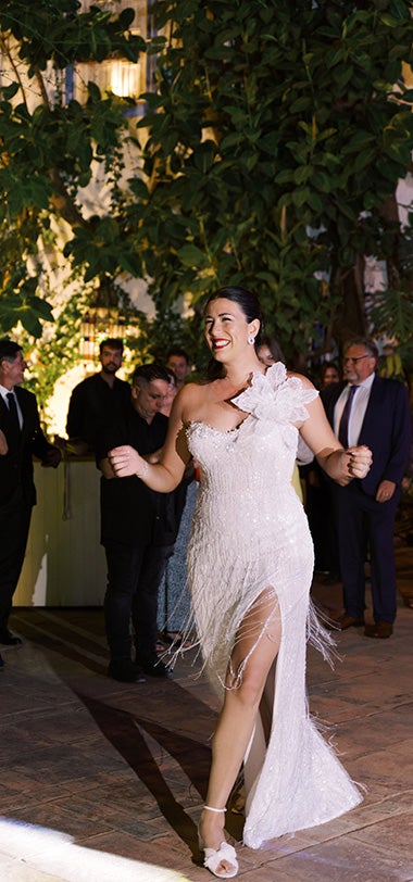 Para la recepción, Muguruza cambió a un diseño de silueta columna con escote palabra de honor. Este vestido, adornado con flecos de cristal de rocaille y flores bordadas, aportaba un toque más moderno y ligero, ideal para la celebración.