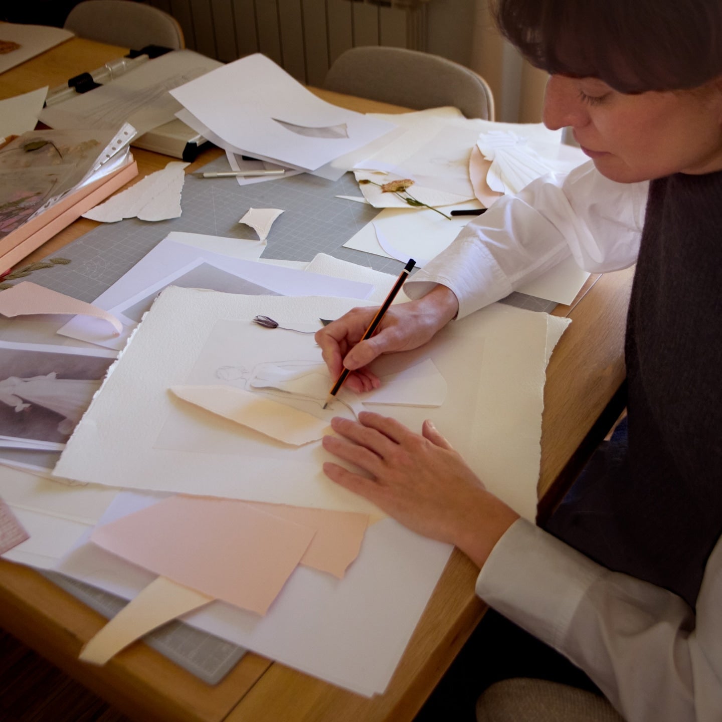 Como parte del proyecto, Alejandra ha creado cinco sketches originales, cada uno reinterpretando un vestido de Atelier perteneciente a la colección 2026. Cada ilustración va acompañada de un breve poema, concebido como un susurro visual y literario que amplifica la emoción del diseño.