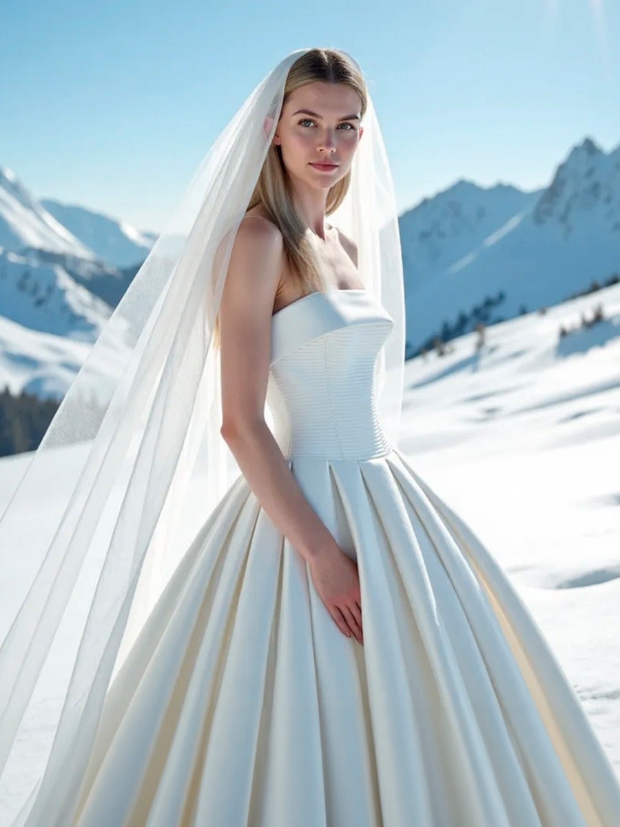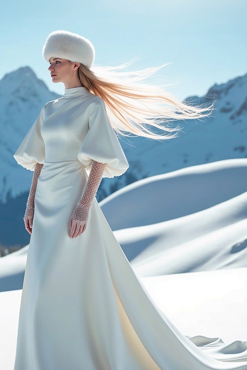 Cada diseño es una obra de arte que narra su propia historia, creada con exquisita atención al detalle para reflejar elegancia, personalidad y un encanto que trasciende el tiempo. Desde las estructuras impecables de las siluetas modernas hasta la fluidez etérea de románticas colas que parecen flotar en el aire, estos vestidos resplandecen con una sofisticación natural sobre las cumbres nevadas.