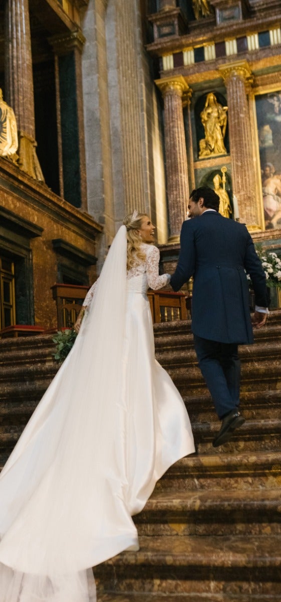 Para la ceremonia, eligió el modelo Close, un elegante vestido de mikado de seda con escote corazón y chaqueta de encaje bordado, que le aportó un aire clásico y sofisticado.