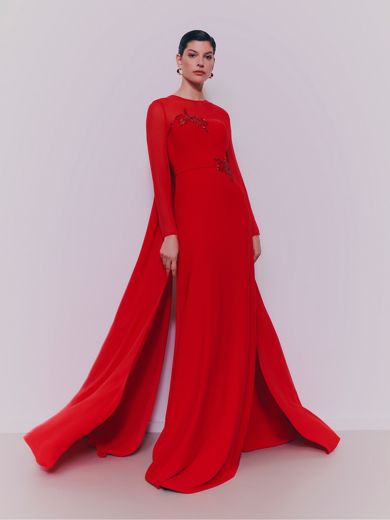 Se il ricevimento si prolunga fino alla sera, punta su tonalità più profonde e materiali che catturano la luce. Un abito da cerimonia a maniche lunghe in prugna o in blu notte è perfetto per un’eleganza naturale. Chi preferisce un look tradizionale può scegliere un abito in raso o velluto leggero, sempre a maniche lunghe o a tre quarti.