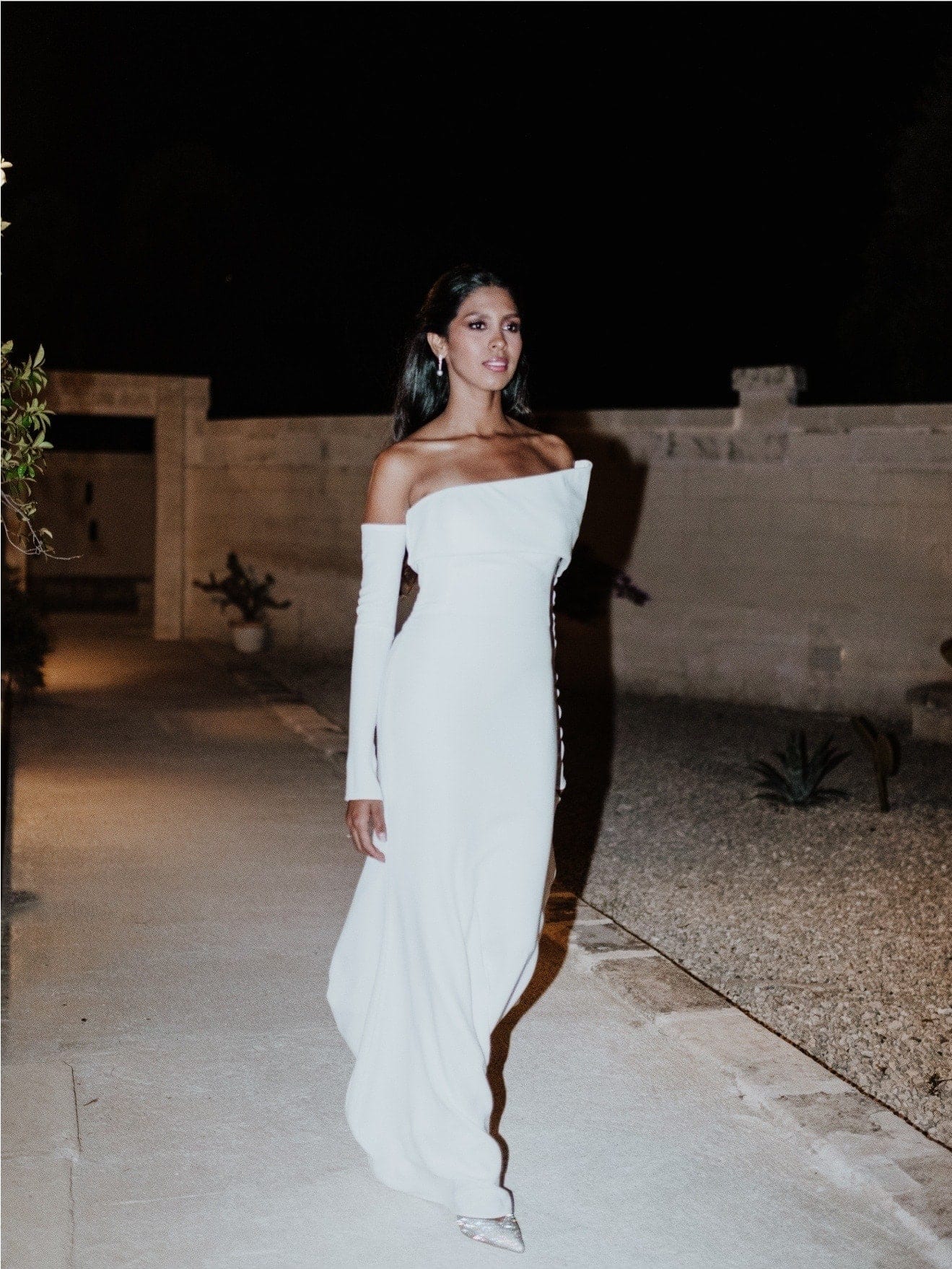 Come ultimo cambio, Nayra ha scelto l’abito SKYLIGHT della linea Atelier Pronovias. Questo elegante abito da sposa dalla linea dritta è caratterizzato da uno scollo a cuore senza spalline, che esalta delicatamente le spalle e il décolleté. Il tessuto di alta qualità brilla e cade con grazia lungo il corpo, creando una silhouette fluida e sofisticata.