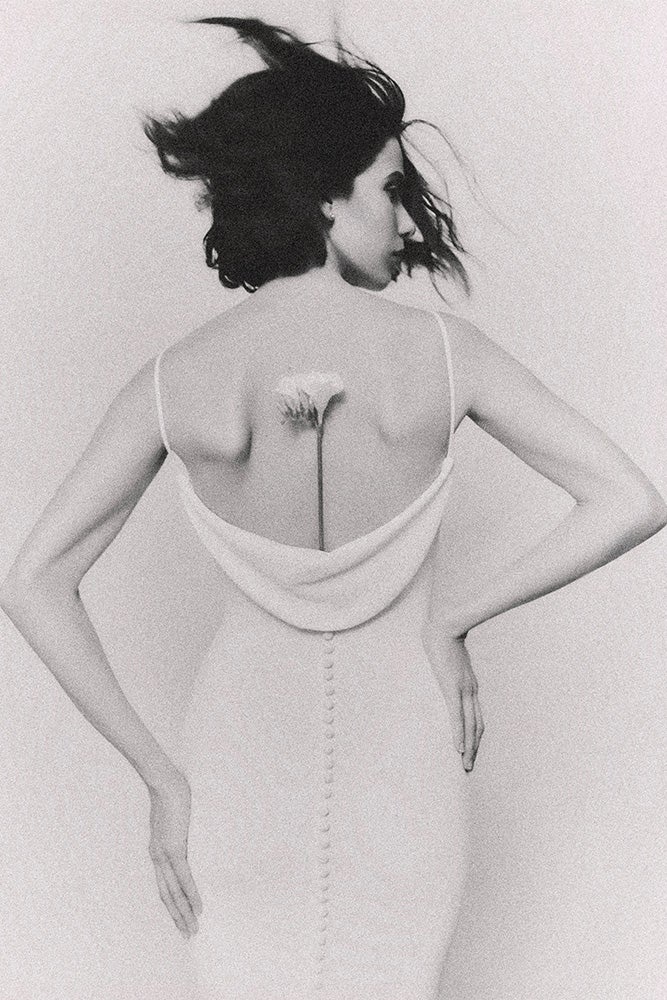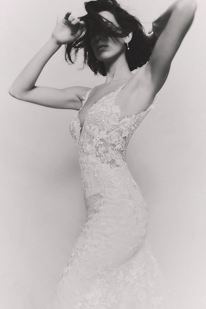 Każda suknia obejmuje delikatne rzemiosło, z koronką na nowo wyobrażoną o lekkości i wdzięku. Kwiatowe aplikacje rozkwitają na dekoltach, talii i obszyciach, dodając organicznego, artystycznego charakteru. Płynne tkaniny i prześwitujące tekstury tworzą eteryczną, płynną sylwetkę.